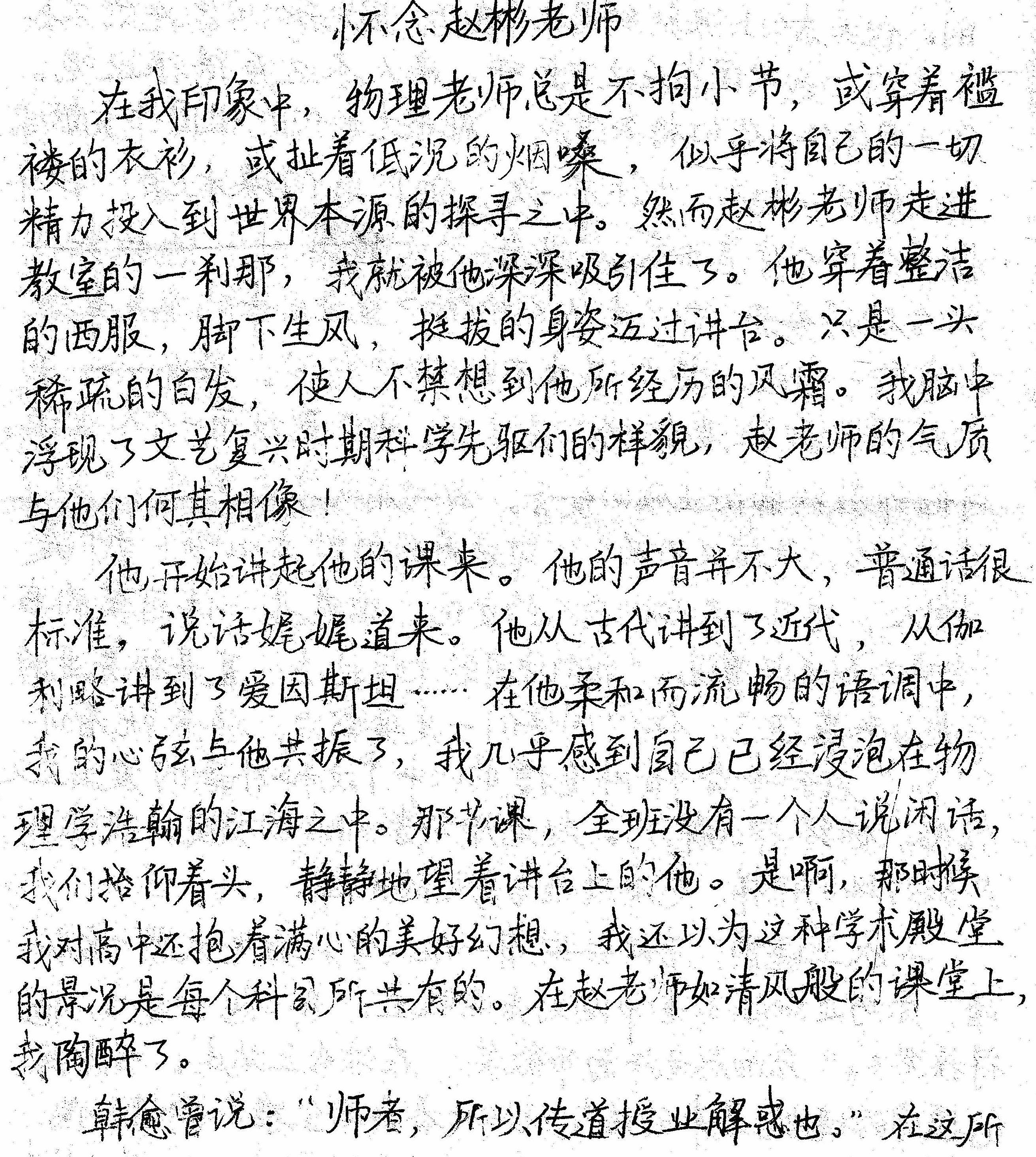 他开始讲起他的课来。他的声音并不大,普通话很标准,讲得娓娓道来。他从古代讲到了近代,从伽利略讲到了爱因斯坦……在他柔和而流畅的语调中,我的心弦与他共振了,我几乎感到自己已经浸泡在物理学浩翰的江海之中。那节课,全班没有一个人说闲话,我们仰着头,静静地望着讲台上的他。是啊,那时候我对高中还抱着满心的美好幻想,还以为这种学术殿堂的氛围是每个科目都有的。在赵老师如清风拂面般的课堂上,我陶醉了。