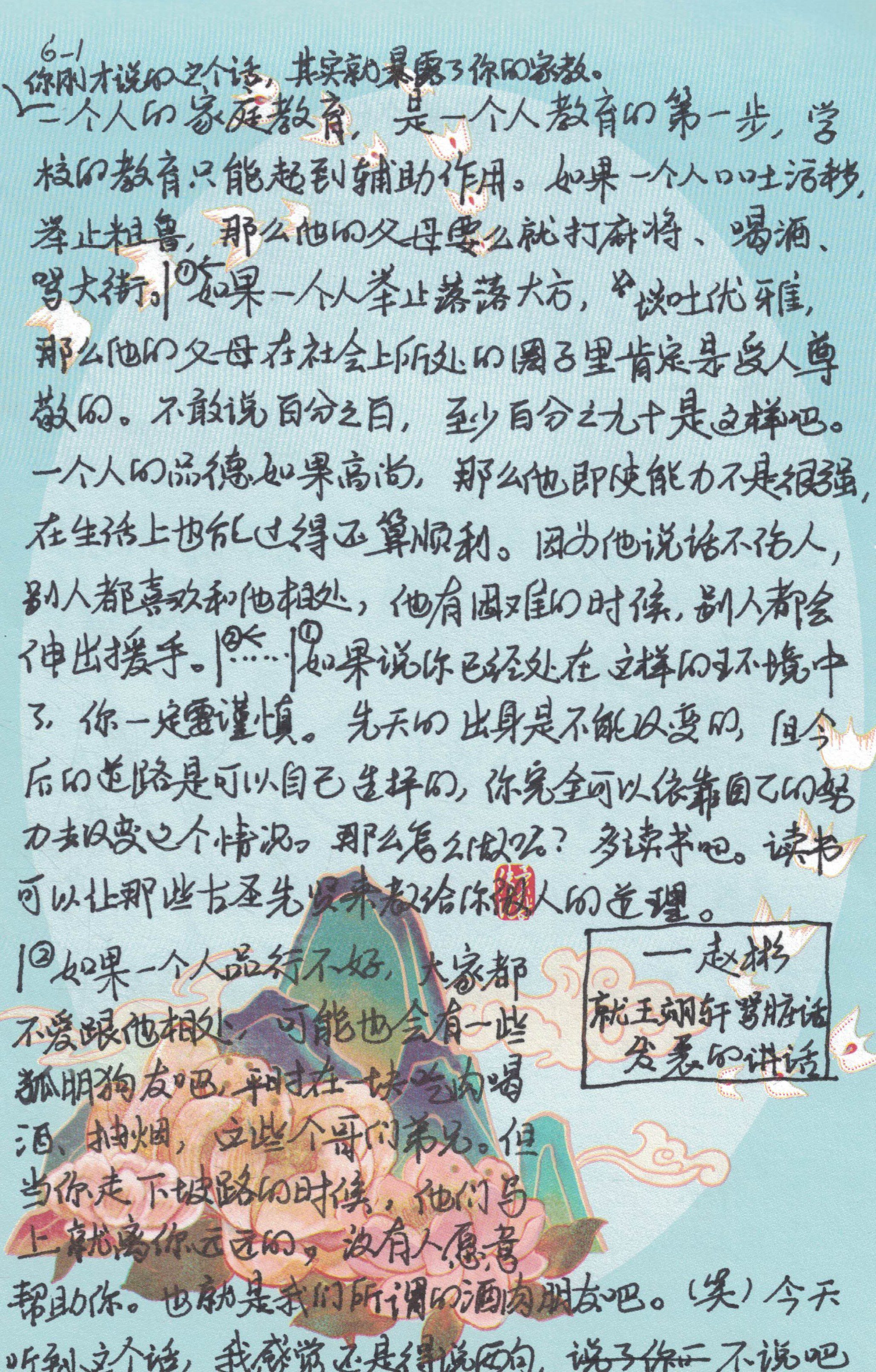 一次上课前,有一位同学在班里大骂一句脏话,不巧这时候赵老师刚好走进教室。我心想:“完了,他得挨骂了。”然而赵老师面带微笑,在讲台上站定,依然用他惯常的娓娓道来的语气说了一番我毕生难忘的话——他并没有骂那位同学,而是告诉我们家教对人的影响,告诫我们注重读书修身,“让古圣先贤来教给你做人的道理”。最后他笑着说:“今天听到这个话,我感觉我还是得说两句,不说吧我得对你负责,说了吧你可能也不爱听。这就是我给同学们进行的这个德育。”我不知道那位同学听了这番德育后作何感想,但我听后感到万分惭愧。我不正是那种“其志嘐嘐然”的人吗?也不读书,也不修身,每天攻击这个批判那个。我将赵老师这番数百字的话凭记忆记在本子上,后来每每重温,都感到发人深省,警钟长鸣。我才知道:真正的教育,不是比谁嗓门有多大,管理有多严,而是看它是否深刻到足以触动一个人的内心。用最温柔的语言,说出最深刻的道理,没有任何冒犯、诋毁与管束,这是赵老师让我见识到的教育。